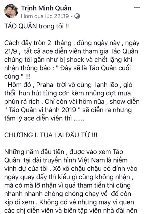 Trong khi các nghệ sĩ chính của Táo quân khi được hỏi đều cho biết, chưa nhận được thông tin về việc dừng chương trình thì trên trang cá nhân, ca sĩ Minh Quân cho biết: "Cách đây tròn 2 tháng, đúng ngày này, ngày 21/9, tất cả anh em diễn diễn viên tham gia Táo uân chúng tôi gần như bị shock và chết lặng khi nhận thông báo: "Đây sẽ là Táo quân cuối cùng".