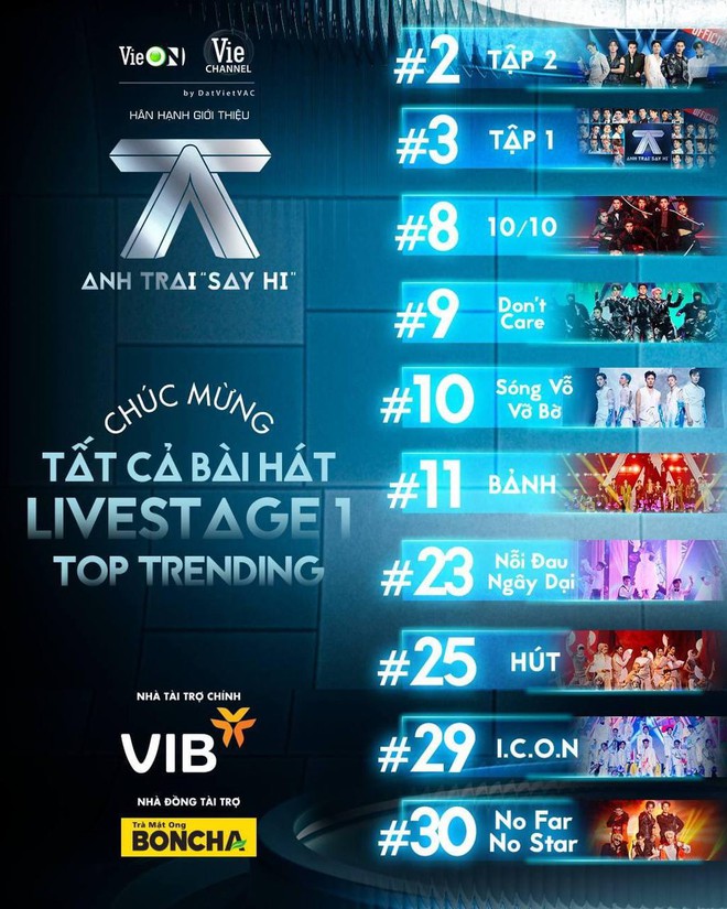 Tối 26/6, cả 6 stage của Anh trai say Hi đều lọt top 30 trending YouTube Việt Nam, cho thấy độ hot "hàng thật giá thật". Trong đó, xếp hạng cao nhất phải kể đến tiết mục 10/10 ở vị trí thứ 8 BXH xu hướng.