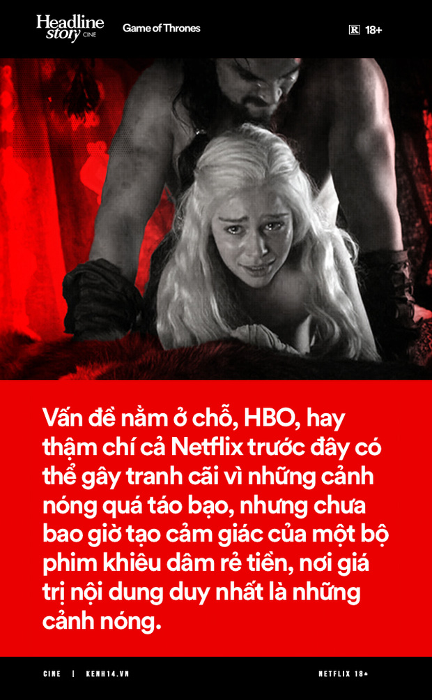 Thực tế, mức độ sốc của cảnh 18+ với Netflix là chẳng hề mới. Netflix từ lâu vẫn luôn ra đời những nội dung gây sốc và thách thức các chuẩn mực kiểm duyệt. Cảnh nóng của Netflix cũng chỉ ngang tầm Game of Thrones (Trò Chơi Vương Quyền), hay cảnh full không che toàn bộ đằng trước thì HBO thậm chí đã gây bàn tán với Euphoria (Lâng Lâng) từ tận năm ngoái. HBO, hay thậm chí cả Netflix trước đây có thể gây tranh cãi vì những cảnh nóng quá táo bạo, nhưng chưa bao giờ tạo cảm giác của một bộ phim khiêu dâm rẻ tiền, nơi giá trị nội dung duy nhất là những cảnh nóng.