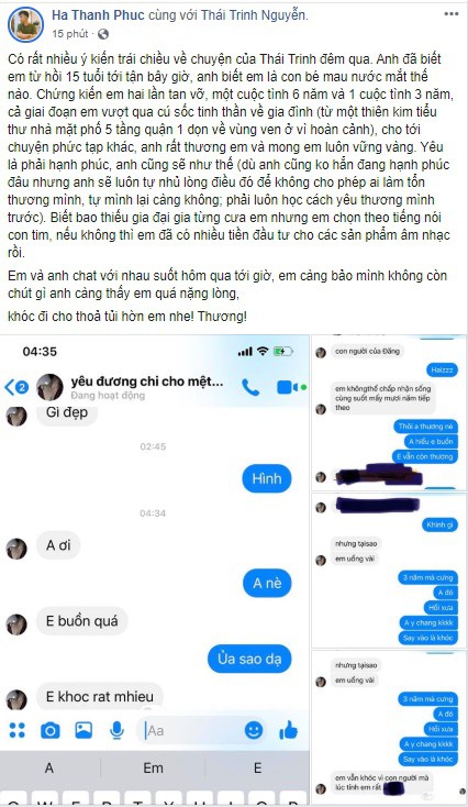 Bên việc lên tiếng bênh vực cho cô em gái Thái Trinh, nhà văn Hà Thanh Phúc cũng chụp lại đoạn nói chuyện giữa cả hai. Có thể thấy Thái Trinh vẫn còn khá đau khổ sau khi chia tay Quang Đăng.