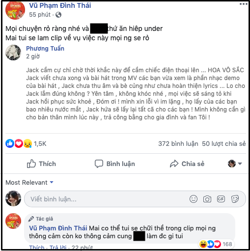 Khi lùm xùm về mối quan hệ bất hòa giữa Jack và K-ICM chưa có dấu hiệu ‘hạ nhiệt’ thì mới đây Thái Vũ FAPtv – một người anh thân thiết với Jack đã ẩn ý lên tiếng. Theo đó trên trang cá nhân, Thái Vũ chia sẻ lại bài đăng của Jack kèm dòng trạng thái: “Mọi chuyện rõ ràng nhé, mai tui sẽ làm clip về vụ việc này, mọi người sẽ rõ”.