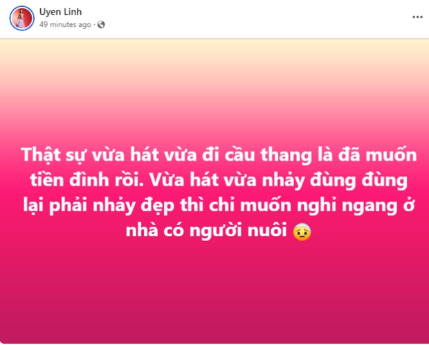 Mới đây, "chị đẹp" Uyên Linh đã có dòng trạng thái nửa đùa, nửa thật. Dù không đề cập trực tiếp song ai cũng hiểu dòng trạng thái nói về trải nghiệm của Uyên Linh khi tham dự show Chị Đẹp Đạp Gió Rẽ Sóng. Cụ thể, Uyên Linh cho biết: "Thật sự vừa hát vừa đi cầu thang là đã muốn tiền đình rồi. Vừa hát vừa nhảy đùng đùng lại phải nhảy đẹp thì chỉ muốn nghỉ ngang ở nhà có người nuôi!".