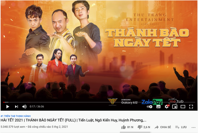 Sau 4 ngày ra mắt, phim hài Tết "Thánh bào ngày Tết" của Tiến Luật - Thu Trang đã đạt Top 1 Trending YouTube. Bộ phim đã thu về hơn 5 triệu view, có 81.000 lượt like cùng hàng ngàn bình luận. Đây là thành tích khá bất ngờ với gia đình Thu Trang - Tiến Luật.