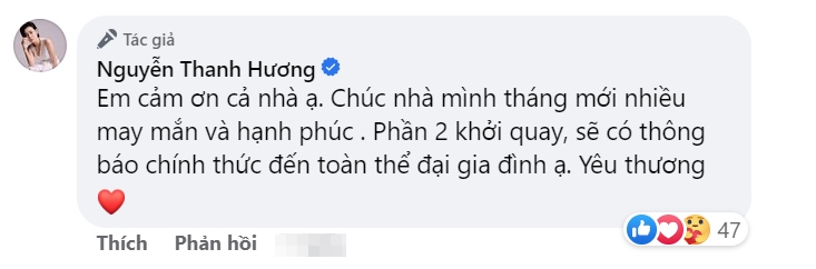 "Em cảm ơn cả nhà ạ. Chúc nhà mình tháng mới nhiều may mắn và hạnh phúc. Phần 2 khởi quay, sẽ có thông báo chính thức đến toàn thể đại gia đình ạ. Yêu thương!".