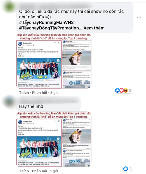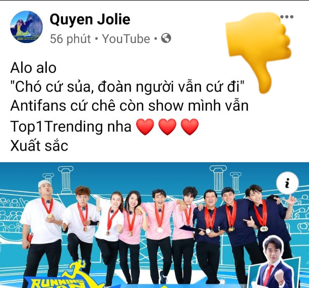 Chẳng là sau khi tập 2 của Running Man Vietnam 2021 - Chơi là chạy đạt vị trí Top 1 Trending YouTube, Quyên Jolie đã chia sẻ thông tin với lời lẽ không mấy hay ho về khán giả. Lập tức, cư dân mạng nổi giận và tấn công Running Man Vietnam 2021. Nhiều người tràn vào Fanpage lẫn kênh YouTube chính thức của chương trình để tấn công với lời lẽ nặng nề.