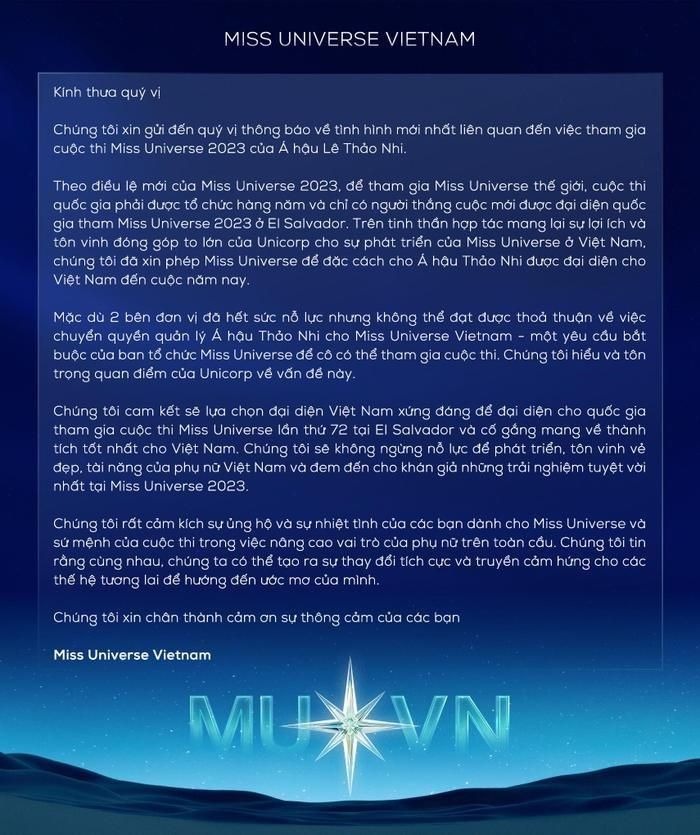 Miss Universe Vietnam cho biết sẽ tổ chức tìm kiếm đại diện mới của Việt Nam tại Miss Universe 2023: "Chúng tôi cam kết lựa chọn đại diện Việt Nam xứng đáng để đại diện cho quốc gia tham gia cuộc thi Miss Universe lần thứ 72 tại El Salvador và cố gắng mang về thành tích tốt nhất cho Việt Nam".