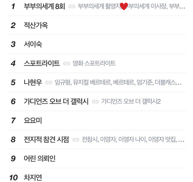 Trong tối ngày 18/4, nếu như Quân Vương Bất Diệt gần như "biệt tăm" khỏi BXH từ khóa tìm kiếm real-time trên cổng thông tin Naver, từ khóa "tập 8 Thế Giới Hôn Nhân" đã dần leo top từ khi chưa lên sóng và hiện giờ đang đứng vững ngôi đầu bảng dù đã quá nửa đêm tại Hàn. Với những tình tiết gây sang chấn tinh thần, căng thẳng cực độ trong "drama" hôn nhân của cặp vợ chồng Sun Woo (Kim Hee Ae) và Tae Oh (Park Hae Joon), Thế Giới Hôn Nhân có lẽ đang nhận được sự chú ý của khán giả Hàn nhiều hơn hẳn.