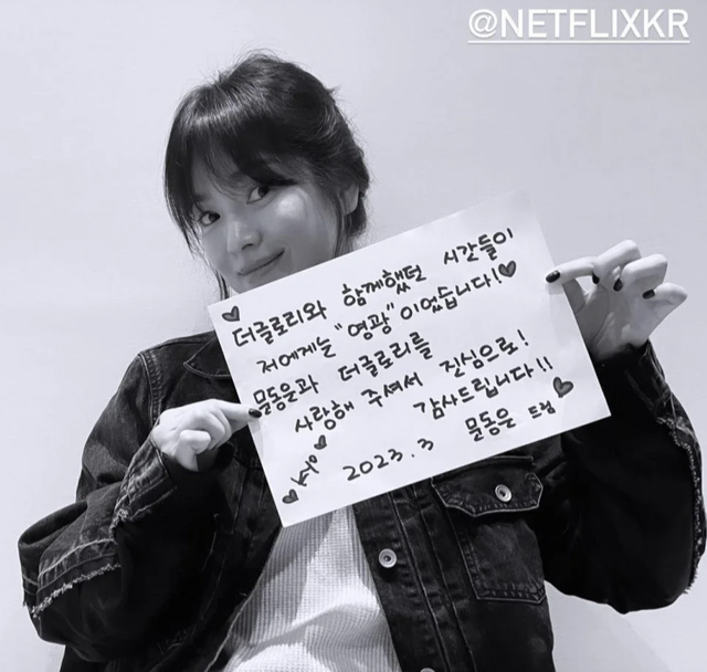 Ngày 3/4, nữ diễn viên Song Hye Kyo đã đăng tấm thiệp nhắn được viết bằng chữ viết tay của mình lên trang mạng xã hội cá nhân. Trên mảnh giấy, cô viết: "Khoảng thời gian đồng hành cùng 'The Glory' là niềm vinh dự đối với tôi. Xin chân thành cảm ơn các bạn đã yêu mến Moon Dong Eun và 'The Glory'".