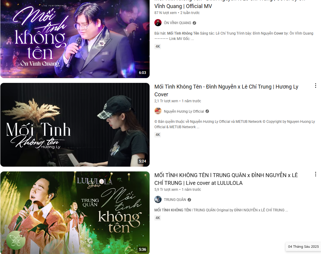 - Sau khi được cấp phép chính thức, ca sĩ Đình Nguyễn đã sử dụng và ra mắt ca khúc/ MV Mối Tình Không Tên trên mọi nền tảng từ 9/2023, sau khi phát hành 1 tuần thì được top 1 zing chart và hơn 100 triệu lượt nghe trên mọi nền tảng, nhanh chóng trở thành hít sau 1 tuần phát hành. Được sự đồng ý giữa 2 bên: nhạc sĩ và đơn vị sở hữu độc quyền ca khúc, tôi đã có chủ động làm việc với một số nghệ sĩ để cho phép sử dụng dưới hình thức hát cover, ghi hình biểu diễn trên sân khấu và phát hành clip ghi hình biểu diễn trên các nền tảng. Tuy nhiên, phía tôi và đơn vị sở hữu độc quyền ca khúc “Mối Tình Không Tên” đã thỏa thuận sẽ cho phép hoạt động: cover, ghi hình biểu diễn trên sân khấu và phát hành clip ghi hình biểu diễn trên các nền tảng CÓ THỜI HẠN.