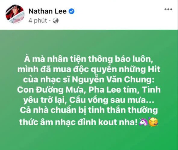 Cách đây chỉ 1 ngày, Nathan Lee khiến dân tình bất ngờ khi thông bao đã mua độc quyền những bản hit của nhạc sĩ Nguyễn Văn Chung như Con Đường Mưa, Pha Lê Tím, Tình Yêu Trở Lại, Cầu Vồng Sau Mưa,... Anh cũng cho biết trong thời gian sắp tới, anh sẽ cho ra mắt những sản phẩm âm nhạc này để khán giả thưởng thức 'âm nhạc đỉnh cao'.