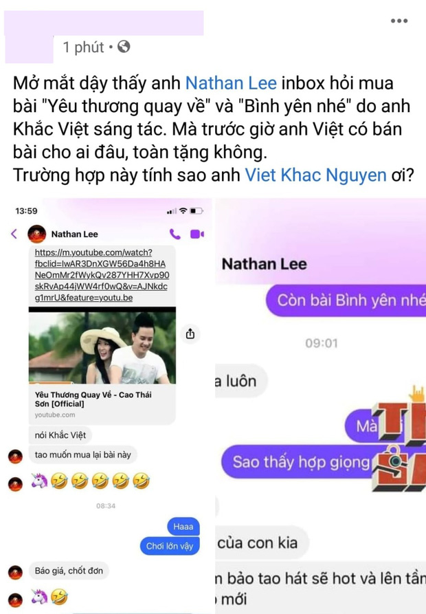 Tuy nhiên, người này cũng cho hay, những sản phẩm các nghệ sĩ thể hiện do nhạc sĩ Khắc Việt sáng tác đa phần là để tặng chứ thường không bán. Chính vì vậy, việc mua bán ca khúc lần này rất có thể sẽ không được diễn ra. Thế nhưng chỉ ít phút sau Nathan Lee đã thông báo 'chốt đơn' thành công khiến dân mạng 'choáng toàn tập'.
