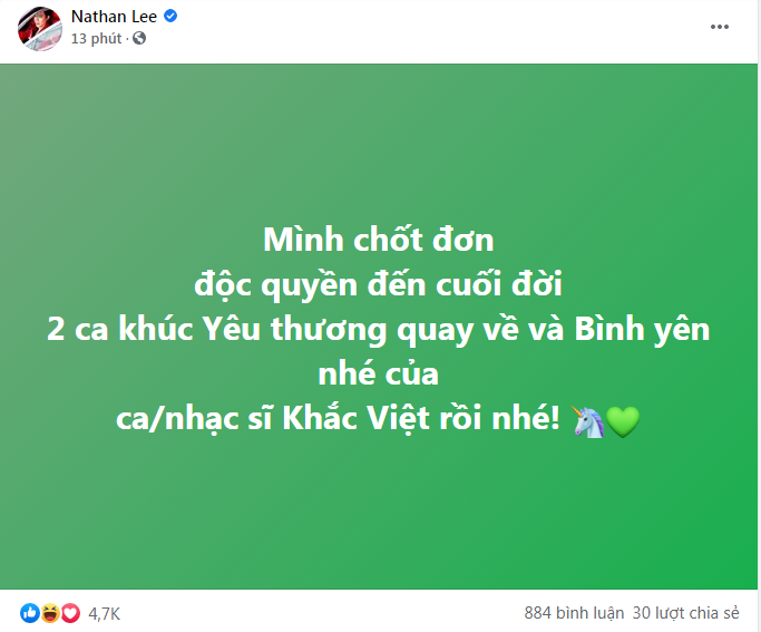 Cách đây ít phút, Nathan Lee tiếp tục khiến dân mạng 'choáng' khi tiếp tục mua thêm hai bản hit của Cao Thái Sơn gồm Yêu Thương Quay Về và Bình Yên Nhé do nhạc sĩ Khắc Việt sáng tác.