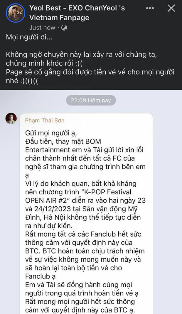 Giữa lúc hoang mang, loạt fanpage lớn nhất của EXO Chanyeol - Xiumin và Chen đồng loạt xác nhận thông tin huỷ show do đại diện từ phía BTC chia sẻ. Theo đoạn tin nhắn được tiết lộ, người được cho là đại diện của Bom Entertainment gửi lời xin lỗi đến các FC, thông báo vì lý do khách quan mà 2 đêm diễn ngày 23-24/12 sắp tới tại Mỹ Đình không thể diễn ra. BTC chương trình chịu trách nhiệm toàn bộ và hứa hoàn vé. Phía Bom Entertainment vẫn chưa có phát ngôn chính thức về việc này.