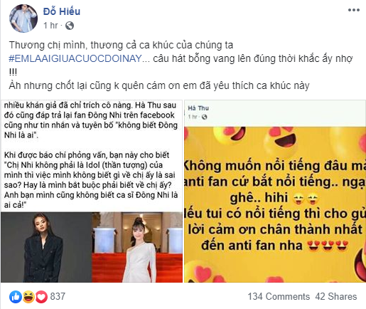 Ngay lập tức, những chia sẻ của Hà Thu như đổ thêm dầu vào lửa khi rất nhiều ý kiến cho rằng cô khá ngông cuồng, dù chỉ đang là thí sinh nhưng lại không "biết người biết ta". Một số gương mặt quen thuộc trong làng giải trí như nhạc sĩ Đỗ Hiếu - đồng tác giả của ca khúc "Xin lỗi anh quá phiền" với Đông Nhi, MC Tùng Leo, Nam Cường, Trung Quân... cũng đã có những động thái lên án thái độ của Hà Thu với đàn chị.