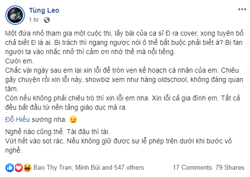 Huống hồ về vấn đề này, chị Nhi và tôi trực tiếp cùng nhau sản xuất ra bài hát và bạn đã thể hiện ca khúc đó nhưng lại nói không biết Đông Nhi là ai. Chưa nói về cương vị của một ngôi sao hạng A, chị Nhi cũng là người đồng sáng tác ca khúc, chúng tôi rất vui vì bạn đã chọn ca khúc của chúng tôi để hát dù chưa xin phép nhưng với thái độ này thì tôi nghĩ là khá thiếu tôn trọng...".