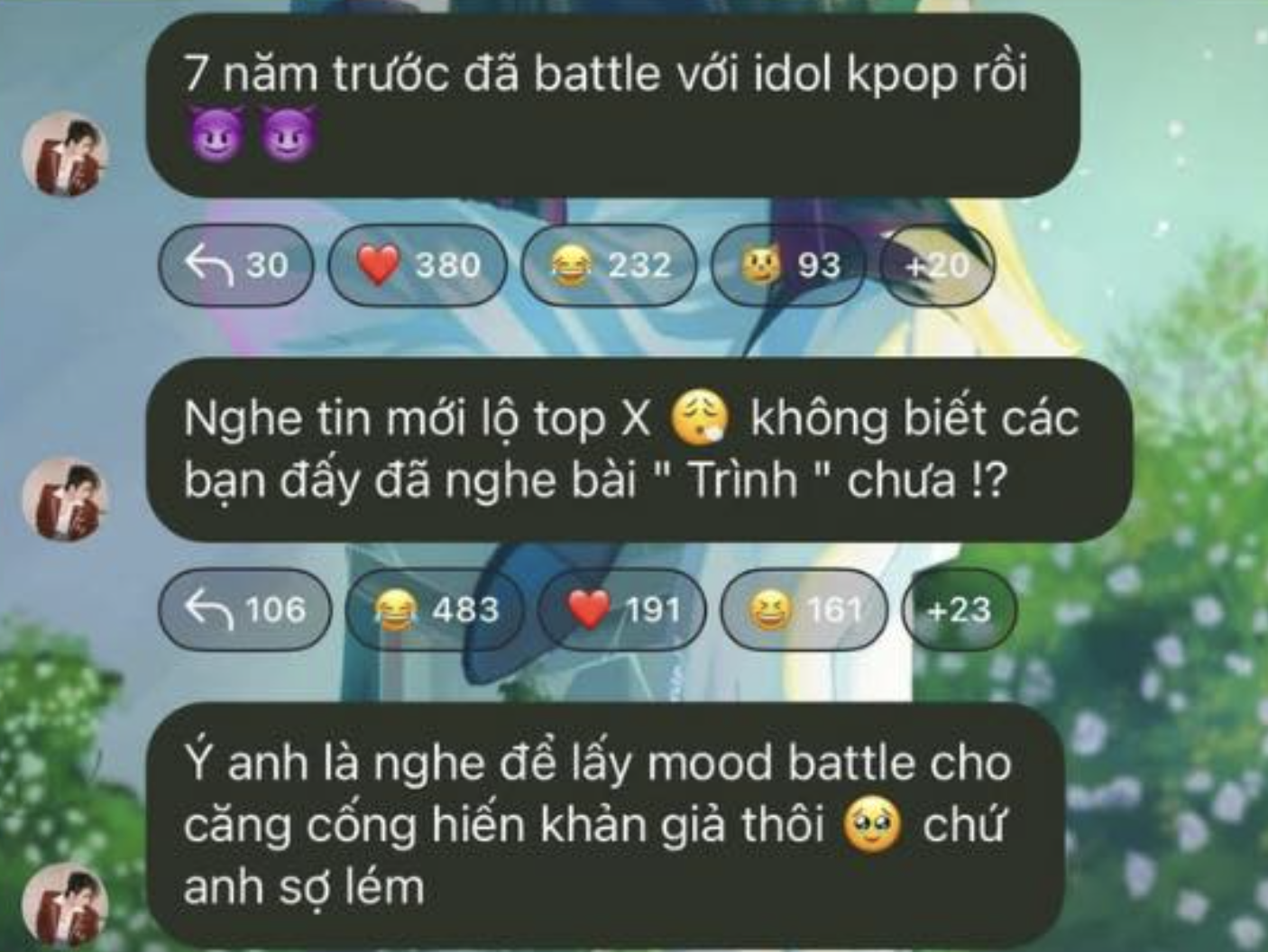 Trong một đoạn chat với fan, Cường Bạch nhắc đến nhóm thí sinh “Top X” chưa lộ diện và đề cập ca khúc TRÌNH của HIEUTHUHAI với thái độ bị cho là mỉa mai: “Không biết các bạn ấy đã nghe bài Trình chưa”.