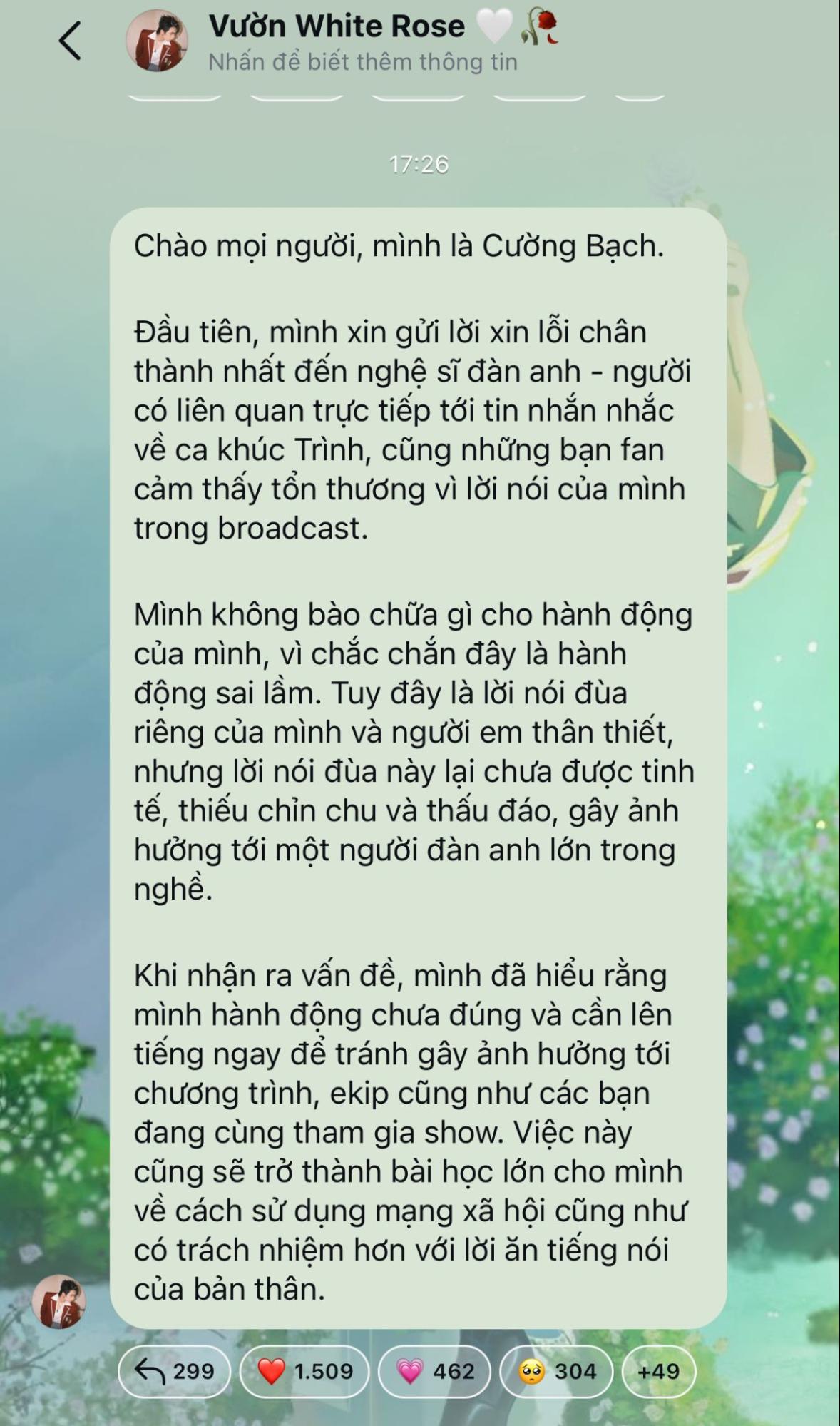 Câu nói này khiến cộng đồng mạng phẫn nộ, chỉ trích anh thiếu tôn trọng đàn anh và cợt nhả kém duyên. Trước làn sóng phản ứng, chiều 26/5, Cường Bạch đã đăng lời xin lỗi trong nhóm chat với người hâm mộ. Anh bày tỏ: “Mình xin gửi lời xin lỗi chân thành đến nghệ sĩ đàn anh và các fan bị tổn thương vì lời nói của mình. Đây là hành động sai lầm, lời đùa thiếu tinh tế và không thấu đáo, gây ảnh hưởng đến một người anh lớn trong nghề”.