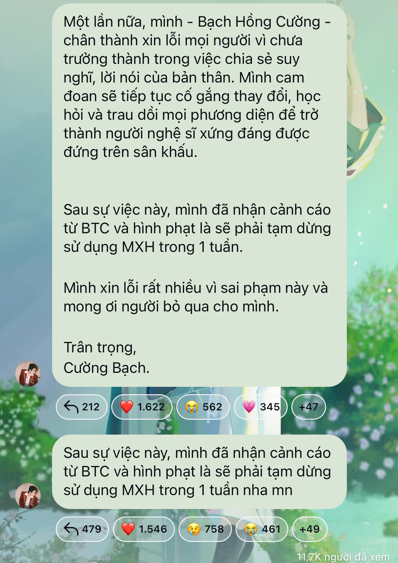 Anh thừa nhận lỗi, cam kết cẩn trọng hơn trong lời nói và tiết lộ đã bị ban tổ chức cảnh cáo, đồng thời bị cấm sử dụng mạng xã hội trong một tuần. Câu nói của Cường Bạch gây tranh cãi vì liên quan đến TRÌNH – ca khúc rap của HIEUTHUHAI ra mắt cuối 2024, mang thông điệp “diss” định kiến nhưng vấp phải ý kiến trái chiều, bị chê nhạt và thiếu điểm nhấn.