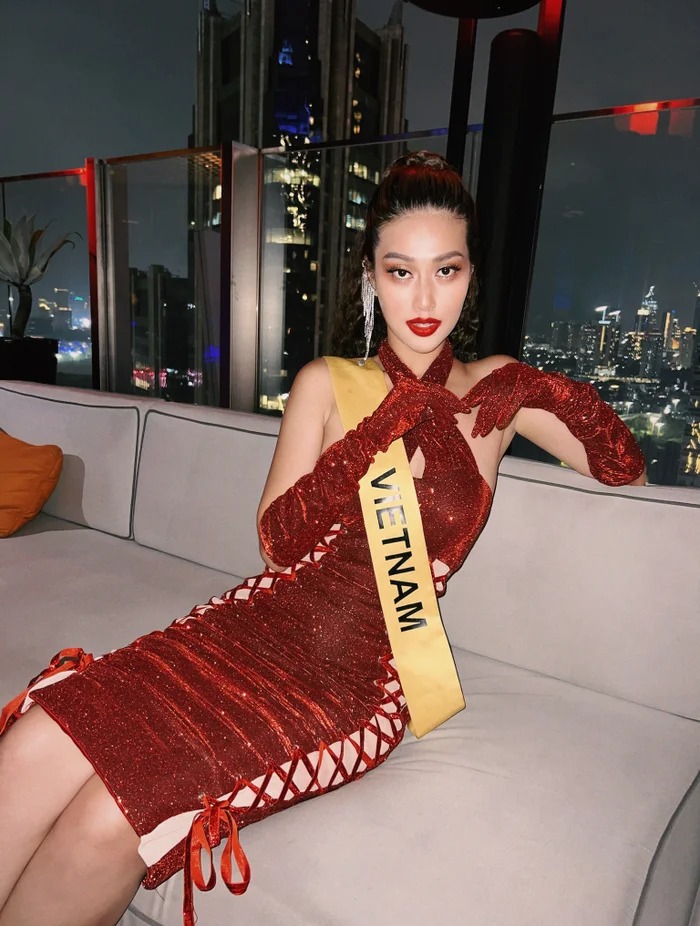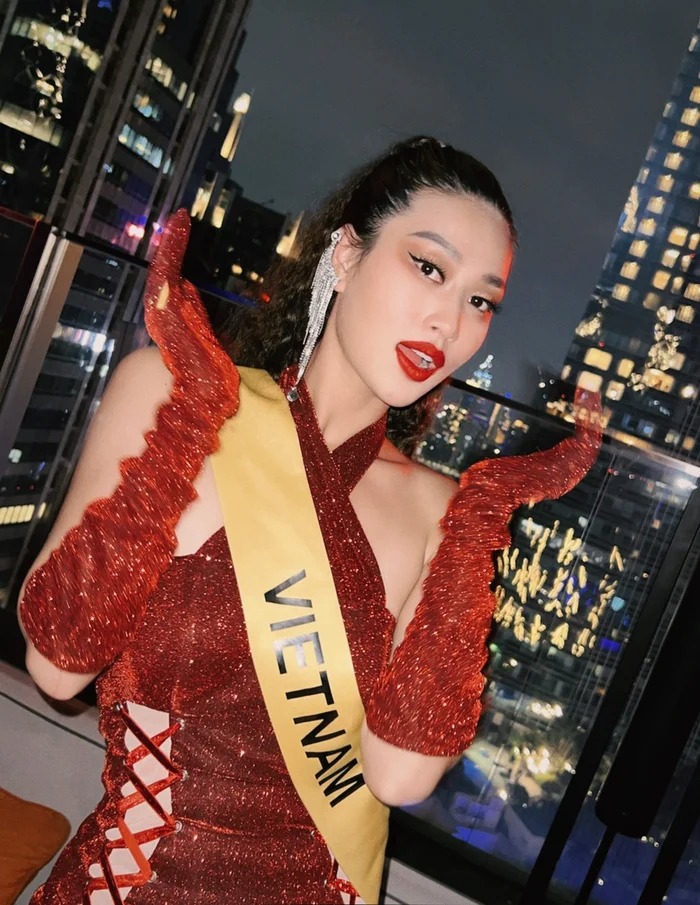 Không phải layout mái tóc suôn dài như mọi người thường thấy, cô chơi lớn khi tự tay bấm xù mái tóc rất cá tính và rất Miss Grand. Điểm cộng lớn nhất cho Thiên Ân chính là khả năng phối đồ của cô rất chất lượng. Màu son đỏ đậm, bộ váy màu đỏ cắt xẻ táo bạo và đôi găng tay cùng tông đã giúp nâng tầm tổng thể visual của người đẹp sinh năm 2000.