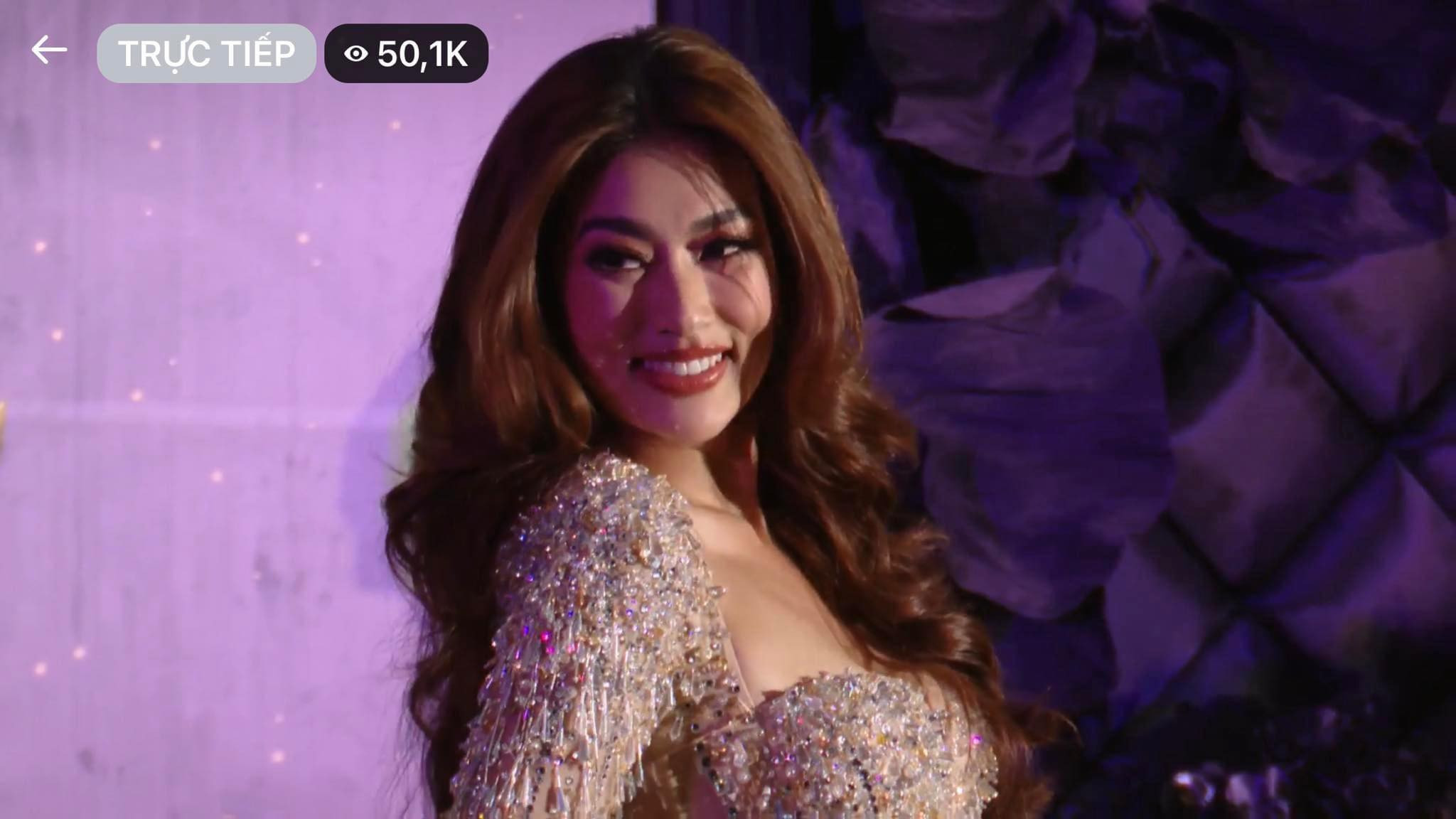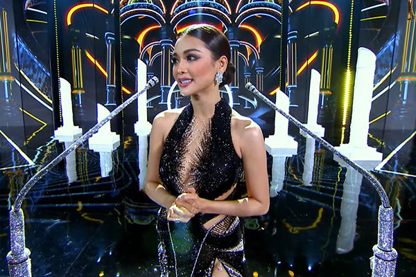 Đại diện Việt Nam xuất hiện trên thảm đen của đêm chung kết Miss Grand International 2022. Các MC tỏ ra thích thú với chiếc đầm tinh xảo đính pha lê của Thiên Ân nên tò mò nguồn gốc và yêu cầu cô trình diễn lại để thấy sự độc đáo của chiếc váy.