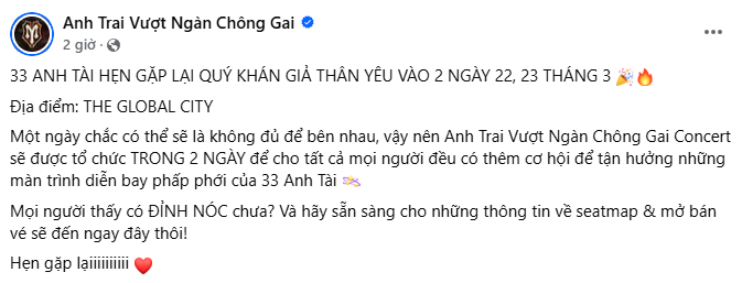 Bẵng đi 1 tháng, fanpage tích xanh Anh Trai Vượt Ngàn Chông Gai mới đây đã đăng tải dòng trạng thái mới, thông báo chính thức khởi động concert Day 3 và 4 trong 2 ngày liên tiếp 22 - 23/3 sắp tới. Địa điểm tổ chức được hé lộ là The Global City - Tổ hợp giải trí và thể thao với quy mô tầm cỡ quốc tế.
