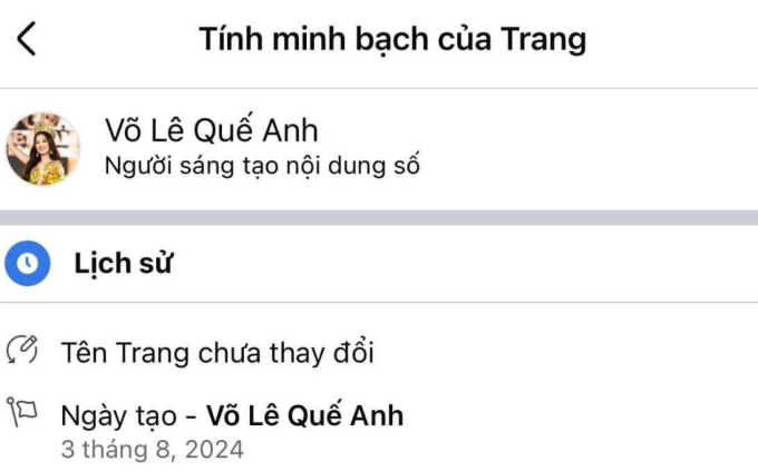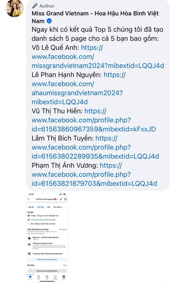 Dưới phần bình luận, phía chương trình còn cho biết ngay khi có kết quả của Top 5 đã tạo danh sách gồm 5 page chính thức cho cả Hoa hậu và 4 Á hậu. Tuy nhiên, cư dân mạng mới đây lại bàn tán xôn xao trước chi tiết lạ. Cụ thể, trang của Hoa hậu Võ Lê Quế Anh được tạo vào ngày 3/8. Đây cũng là ngày mà chung kết cuộc thi Miss Grand Vietnam 2024 diễn ra. Trong khi đó, trang của 4 Á hậu là Lê Phan Hạnh Nguyên, Vũ Thị Thu Hiền, Lâm Thị Bích Tuyền và Phạm Thị Ánh Vương lại được tạo vào ngày 4/8. Thời điểm Quế Anh đăng quang đã qua ngày 4/8, qua 0h do đó không ít người cảm thấy khó hiểu.