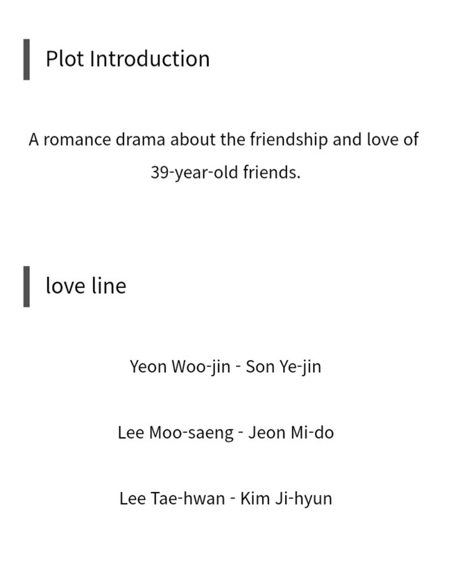 Theo đó, 39 kể về câu chuyện cuộc sống đời thường của 3 người bạn sắp bước sang tuổi 40. Phim sẽ có 3 nữ chính do Son Ye Jin, Jeon Mi Do và Kim Ji Hyun đảm nhận. Phim sẽ kể về câu chuyện cuộc sống, tình yêu của 3 cặp đôi gồm Son Ye Jin - Yeon Won Jin, Lee Moo Saeng - Jeon Mi Do, Lee Tae Hwan - Kim Ji Hyun.