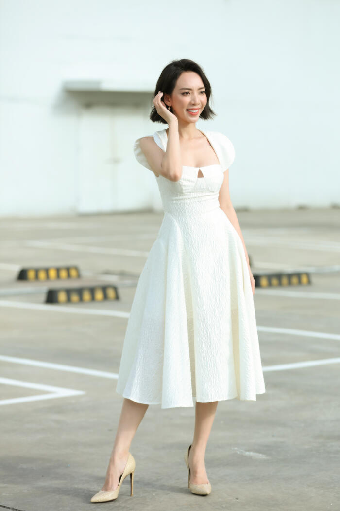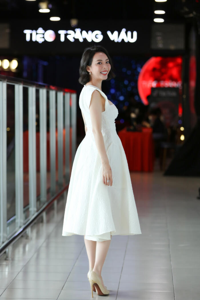 Xuất hiện trong sự kiện, Thu Trang diện chiếc váy trắng khoe ngực đầy gợi cảm chiếm trọn sự chú ý của mọi người. Vì bận việc riêng, Tiến Luật không thể tháp tùng bà xã tới dự họp báo.