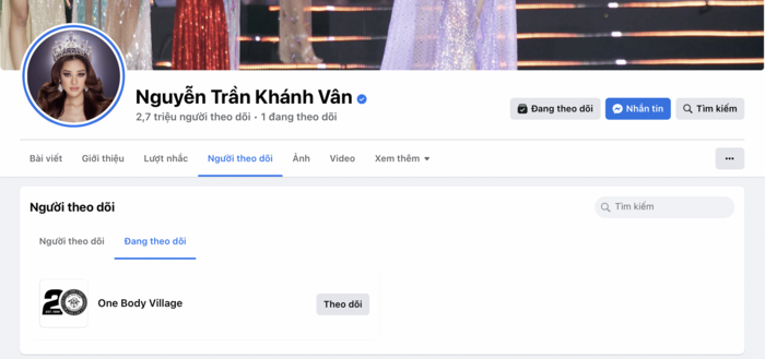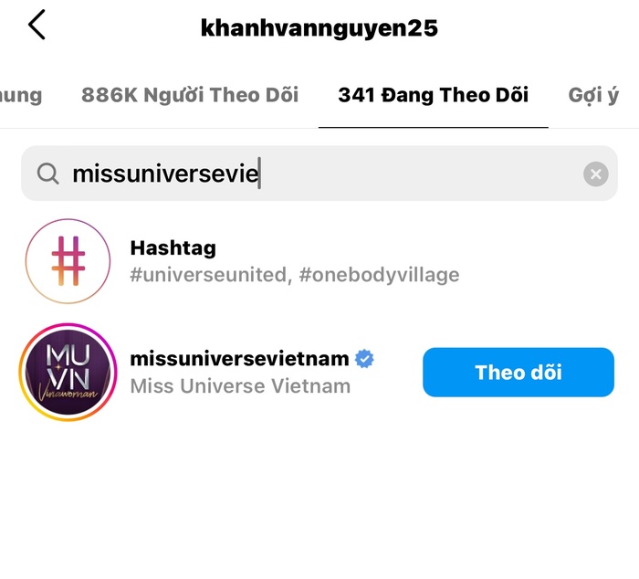 Cô chưa từng theo dõi Miss Universe Vietnam trên Facebook, nhưng Khánh Vân có follow MUVN trên Instagram và chưa bao giờ ấn bỏ theo dõi.