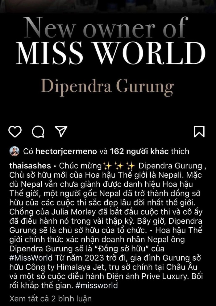 Theo các nguồn tin được chia sẻ rầm rộ, "chủ mới" sẽ chính thức đảm nhận "trọng trách" vận hành cuộc thi Hoa hậu Thế giới từ năm nay và thậm chí còn khăng khăng Miss World 2024 sẽ được tổ chức tại Nepal. Với fan sức đẹp, nếu sự kiện này trở thành sự thật cũng là một điều bất ngờ, bởi lẽ kể từ khi Miss World được thành lập vào năm 1951 cho đến nay ông Eric Morley và vợ của mình là bà Julia Morley (kể từ năm 2000) nắm quyền điều hành cuộc thi.