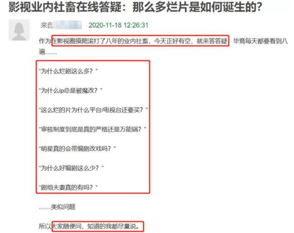 Trong diễn đàn này, cư dân mạng và người đăng bài đã tương tác với nhau vô cùng nhiệt tình. Nội dung chủ yếu là bình luận về lĩnh vực phim ảnh Hoa Ngữ hiện nay có quá ít các kịch bản hay, những tác phẩm chuyển thể thì bị cải biên sai lệch. Tiếp đó, họ bày tỏ về các diễn viên. Người đăng bài đã nhắc đến rất nhiều các ngôi sao đang nổi tiếng hiện nay như Cúc Tịnh Y, Châu Đông Vũ, Nghê Ni, Angela Baby, Triệu Lệ Dĩnh, Tôn Lệ...