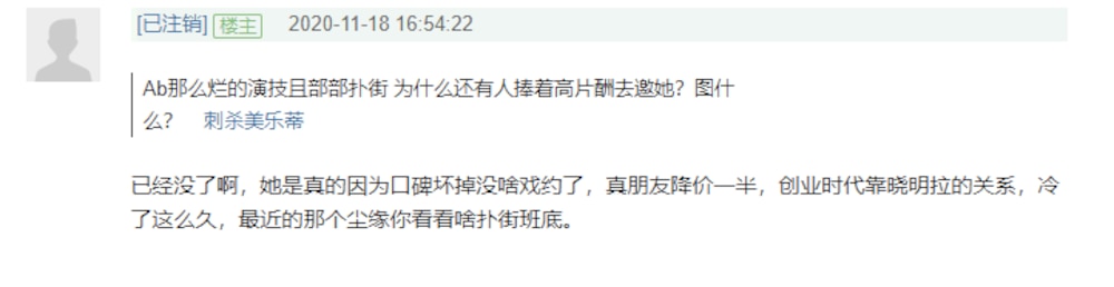 Trước đây, Angelababy đóng rất nhiều bộ phim, dự án này nối tiếp dự án kia. Thế nhưng, thời gian gần đây, khán giả có thể nhận thấy rằng phim của "bà xã Huỳnh Hiểu Minh" rõ ràng đã ít hơn rất nhiều. Giải thích cho điều này, người đăng đàn cho rằng do những đánh giá về Angelababy quá kém khiến cô ấy gần như đã không còn dự án phim để đóng.