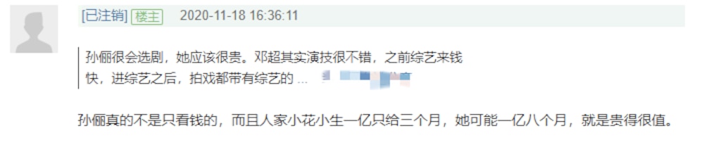 Trong phần tương tác với cư dân mạng, chủ bài viết còn tiết lộ rằng Tôn Lệ là một nữ diễn viên rất biết cách chọn kịch bản. Tuy catse của cô ấy rất cao nhưng cao một cách xứng đáng. Cùng với số tiền đó bỏ ra cho tiểu hoa tiểu sinh, họ sẽ chỉ dành ra một khoảng thời gian 3 tháng, còn Tôn Lệ sẽ dành đến 8 tháng để nghiên cứu kịch bản. Quả thực suốt nhiều năm trong nghề, tính đến thời điểm hiện tại, Tôn Lệ vẫn là cái tên gắn liền với thực lực. Cô vừa có diễn xuất tốt lại có thái độ trách nhiệm cao với nghề nghiệp nên catse của Tôn Lệ cao cũng không có gì đáng bàn cãi.