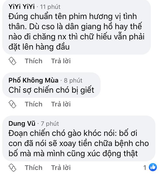 Cảnh phim tuy ngắn nhưng đã chạm đến cảm xúc của nhiều khán giả. Sau khi phim kết thúc, trên các hội nhóm bàn luận về Hương vị tình thân, nhiều người bày tỏ họ đã rơi nước mắt xúc động khi chứng kiến tình cảm, sự hiếu thảo mà Chiến 'chó' - một gã giang hồ bặm trợn dành cho cha của mình.