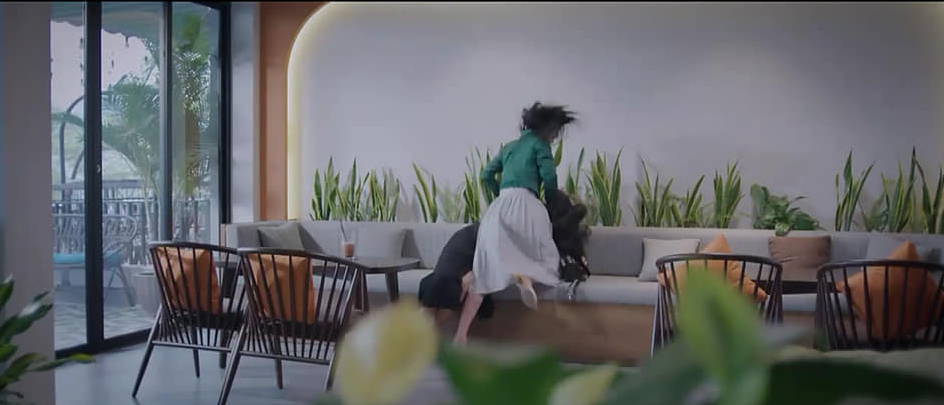 Sau khi Thương định về thì gặp Liên vừa đi đến. Liên vừa gặp đã dành cho Thương hai cú tát lật mặt, một cái vì Thương đã cướp chồng Liên, 1 cái Liên tát thay cho Khánh. Liên nói: 'Mày nên nhớ, ở đời đã có trà xanh thì cũng có trà gừng. Mà cái loại ấy cay lắm, mày không nuốt nổi đâu'. Nói xong Liên xông vào túm tóc, đánh Thương tới tấp.