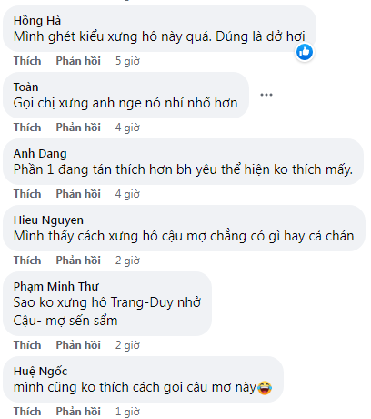 Trong phim Thương ngày nắng về, sau khi bước vào mối quan hệ hẹn hò, cặp đôi Trang - Duy đã đổi cách xưng hô Cậu - Mợ. Tuy nhiên, cách xưng hô này lại khiến nhiều khán giả không hài lòng. Nhiều người cho rằng cách gọi Cậu - Mợ của Trang - Duy vừa gượng vừa sến, không có sự ngọt ngào, lãng mạn của một cặp đôi.