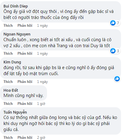 Khán giả cho rằng rất có thể ông Long đã lên một kế hoạch bài bản, cẩn thận với sự giúp sức của vị bác sĩ. Rất có thể ông giả vờ đột quỵ và dặn bác sĩ giữ mọi bí mật với tất cả mọi người, kể cả những người thân của ông và Duy cũng không ngoại lệ.
