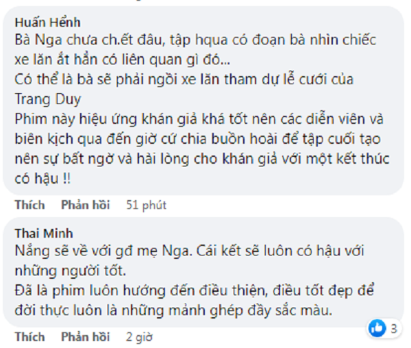 Trong khi nhiều khán giả lo lắng bà Nga sẽ ra đi trong tập cuối Thương Ngày Nắng Về giống như trong bản gốc Hàn Quốc thì NSND Minh Hòa (vai bà Nhung) đã thắp lên hy vọng cho người xem khi đăng tải hình ảnh nhân vật bà Nhung và bà Nga mặc áo dài đôi, nở nụ cười tươi tắn hạnh phúc trong bối cảnh đám cưới của Trang - Duy.