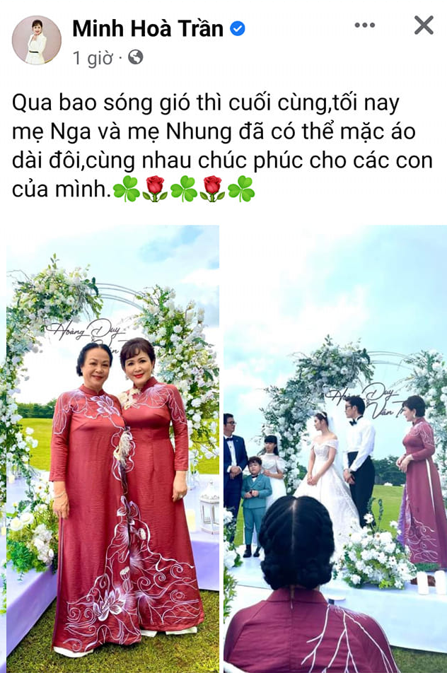 Đính kèm bức ảnh, NSND Minh Hòa chia sẻ: 'Qua bao sóng gió thì cuối cùng, tối nay mẹ Nga và mẹ Nhung đã có thể mặc áo dài đôi, cùng nhau chúc phúc cho các con của mình'