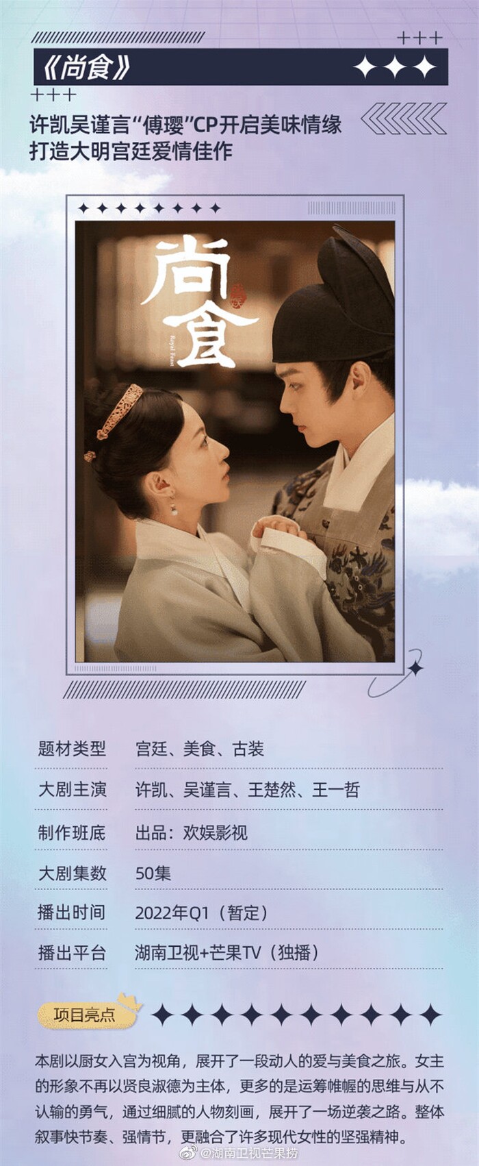 Mới đây, truyền thông Hoa ngữ đưa tin Thượng thực do Hứa Khải và Ngô Cẩn Ngôn đóng chính đã tung trailer ngắn tóm lược nội dung phim. Thượng thực thuộc thể loại phim cổ trang, mỹ thực, cung đình, bao gồm 50 tập, được ấn định lên sóng vào quý 1 năm 2022 trên đài truyền hình Hồ Nam.