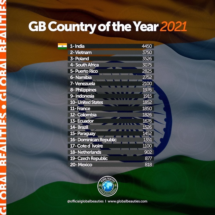 Theo bảng tổng kết của chuyên trang sắc đẹp Global Beauties về số điểm và thứ hạng của các quốc gia trên bản đồ nhan sắc quốc tế trong năm 2021, quá tự hào khi Việt Nam hiện đang ở vị trí thứ 2, chỉ sau Ấn Độ.