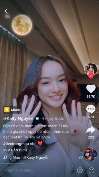 Dàn diễn viên của bom tấn điện ảnh Việt Nam đang "làm mưa làm gió" ngoài rạp – Tiệc Trăng Máu gồm Kaity Nguyễn, Hứa Vĩ Văn, Kiều Minh Tuấn, Hồng Ánh có màn đổ bộ trên TikTok với thử thách cực kỳ vui nhộn và thú vị. Thử thách yêu cầu người chơi giơ 10 ngón tay lên, ứng với 10 tình huống. Với điều nào mà người chơi từng làm thì phải thành thật bỏ 1 ngón tay xuống.