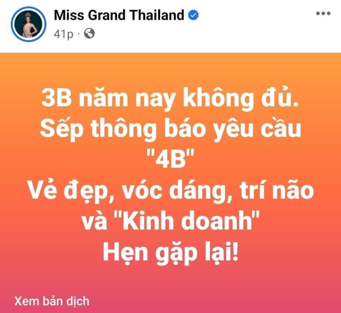 Mới đây, trên trang chủ Miss Grand Thailand bất ngờ đăng tải một thông tin liên quan về tiêu chí mới của cuộc thi. Cụ thể, đấu trường này yêu cầu các cô gái tham gia phải có đủ "4B" bao gồm: Beauty (Sắc đẹp), Body (Hình thể), Brain (Trí tuệ) và một chữ B mới được thêm vào, Bussinesss (Kinh doanh).