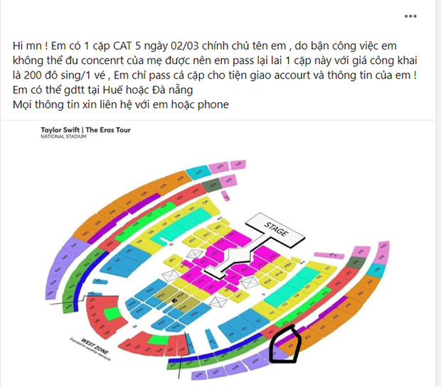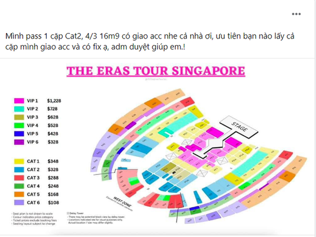 Trên diễn đàn lớn nhất trong việc trao đổi thông tin The Eras Tour tại Singapore - group Facebook Hành trình tham dự The Eras Tour Singapore - không khó để thấy các bài đăng pass vé của rất nhiều khán giả. Thị trường pass vé diễn ra sôi động, từ các khu vực VIP cho đến các CAT đều có nhiều người pass vé. Nhiều người cũng nhượng vé theo gói kết hợp vé dự The Eras Tour với combo khách sạn.