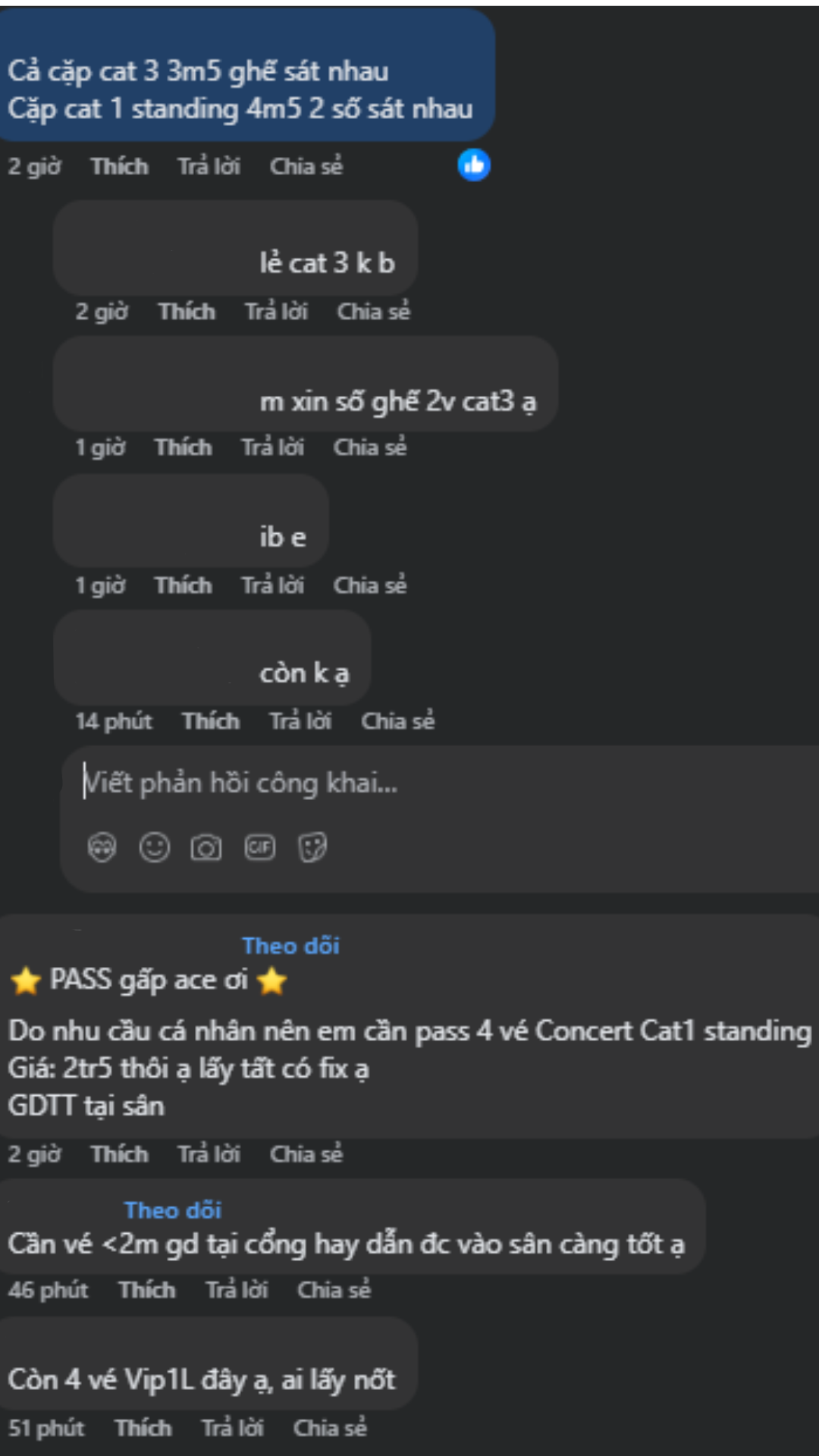 Bên cạnh những dự án, chiến dịch chào mừng idol đến sân nhà, 1 vấn đề khác đang nhận được sự quan tâm lớn từ khán giả Việt chính là tình trạng mua bán vé concert. Theo ghi nhận của chúng tôi, thời gian khoảng 1 tuần trước khi diễn ra đêm nhạc, nhiều bài đăng pass vé xuất hiện hàng loạt trên các nhóm và fanpage cộng đồng. Tình trạng mua đi bán lại vé mega concert có G-Dragon diễn ra cực kỳ phức tạp.