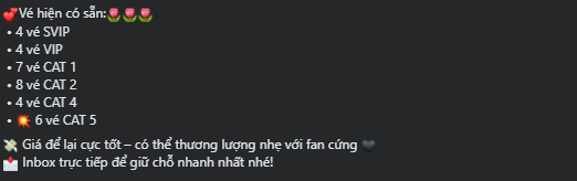 Trước thềm concert, tình trạng pass vé, thật giả lẫn lộn vẫn đang diễn biến phức tạp và khó kiểm soát. Vì thế, người hâm mộ không nên buông lỏng cảnh giác, hạn chế tìm đến cánh phe vé để giao dịch dù có cắt lỗ nhiều. Nếu mua bán bằng bất kỳ phương thức nào, fan cần kiểm tra thông tin người bán và thông tin vé thật kỹ trước khi xuống ví, kiểm tra nguồn vé và mã vé để tránh mua phải vé giả.