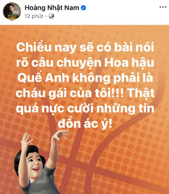 Trước nghi vấn này, đạo diễn Hoàng Nhật Nam đã lập tức có động thái trên trang cá nhân. Theo đó, ông xã bà Phạm Kim Dung viết: "Chiều nay sẽ có bài nói rõ câu chuyện Hoa hậu Quế Anh không phải là cháu gái của tôi. Thật quá nực cười những tin đồn ác ý".