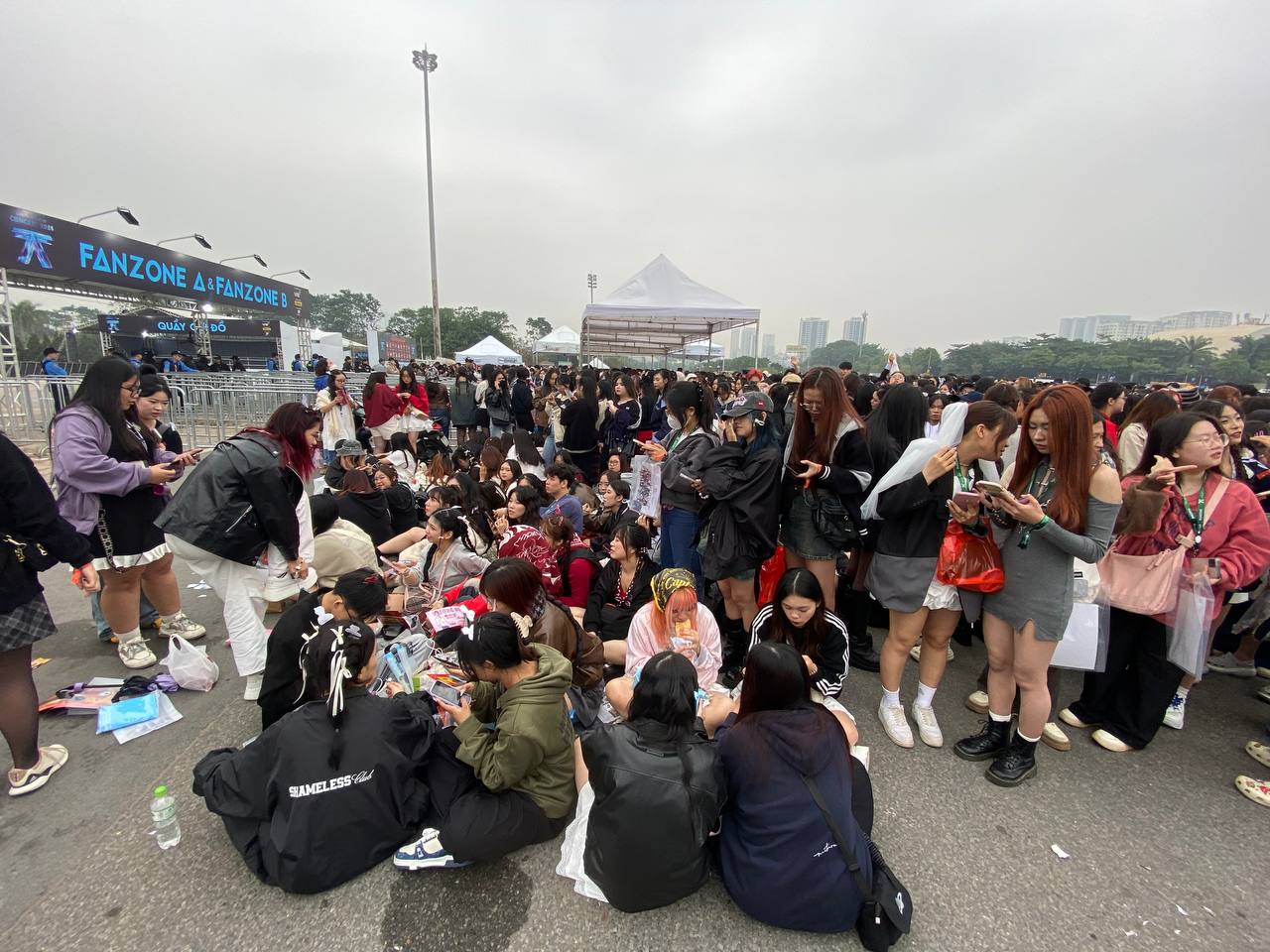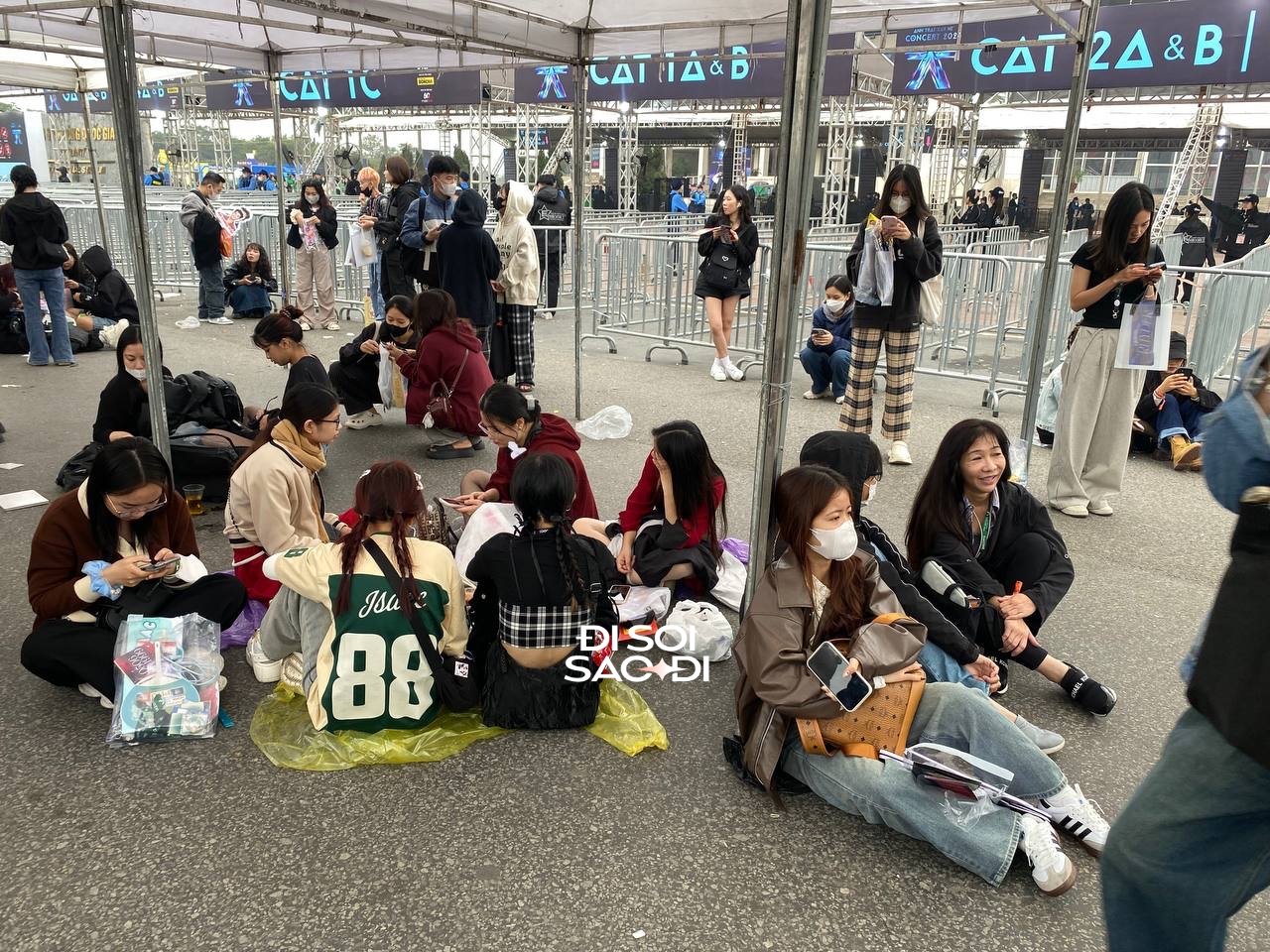 Vì phải "cắm trại" ở sân để giữ vị trí đẹp, nhiều người không tránh được sự mệt mỏi. Ở những khu vực lều check-in có bố trí chỗ ngồi chờ, fan không ngại ngồi, thậm chí nằm ra đất. Cảnh tượng này thường chỉ nhìn thấy ở những concert của siêu sao quốc tế hoặc thần tượng Kpop hàng top.