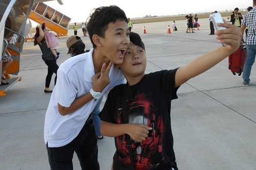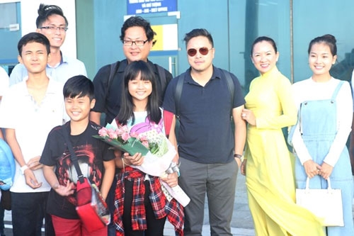 Đạo diễn Victor Vũ cùng 4 diễn viên được chào đón khi đáp chuyến bay xuống sân bay Tuy Hòa. |