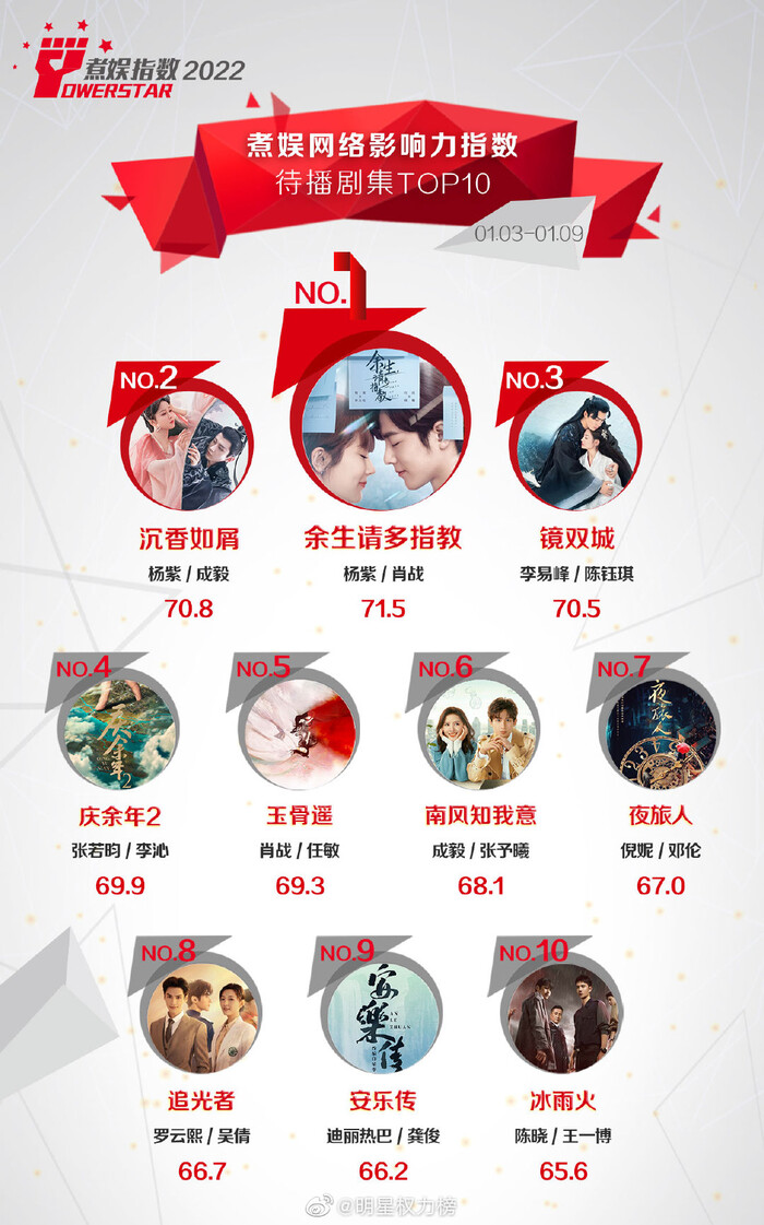 Mới đây, chuyên trang Powerstar đã công bố danh sách top 10 phim Hoa ngữ chưa lên sóng hot nhất tuần 2 tháng 1/2022. Được biết, kết quả này dựa trên thống kê tương tác, bình chọn từ các phiếu bầu của cư dân mạng, người hâm mộ về độ nổi tiếng và sức ảnh hưởng của những bộ phim trên mạng xã hội Weibo ở xứ Trung trong một tuần (3/1/2022 - 9/1/2022).